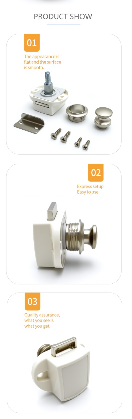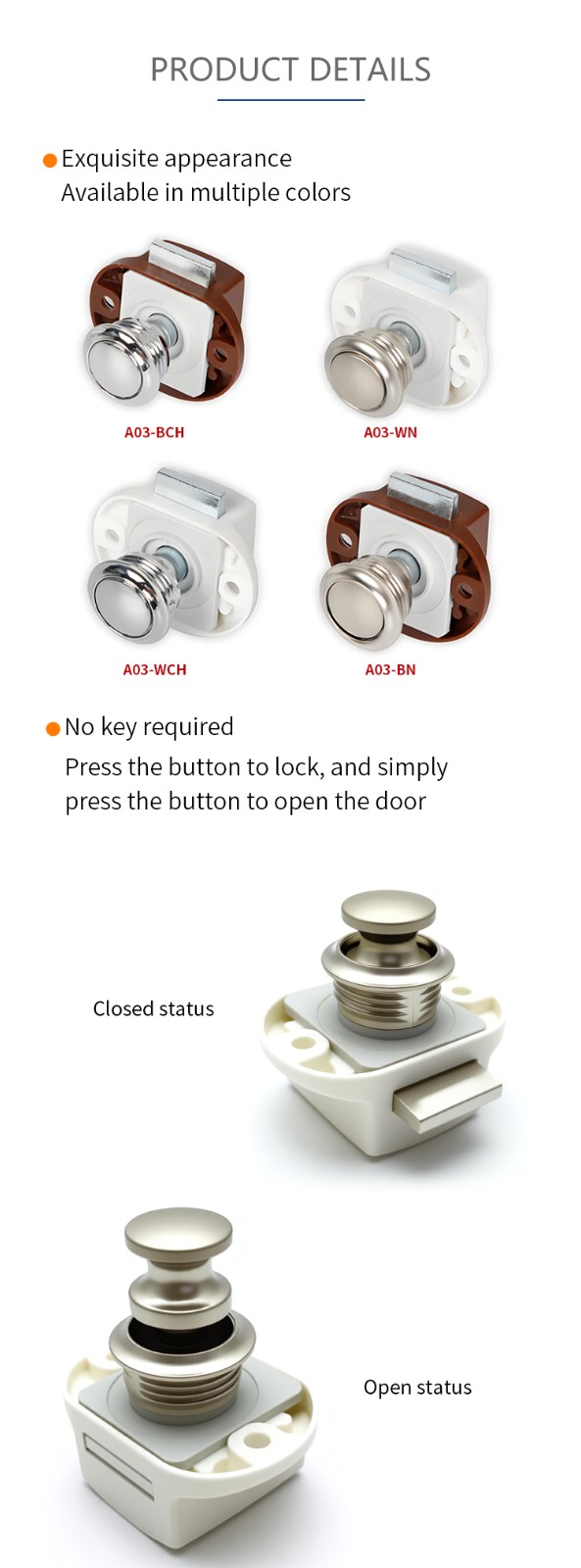 A03 caravan button lock hanging cabinet does not require a key and can be installed without handles. It has hidden locks for the drawer cabinet doors. It also has a push-lock funct