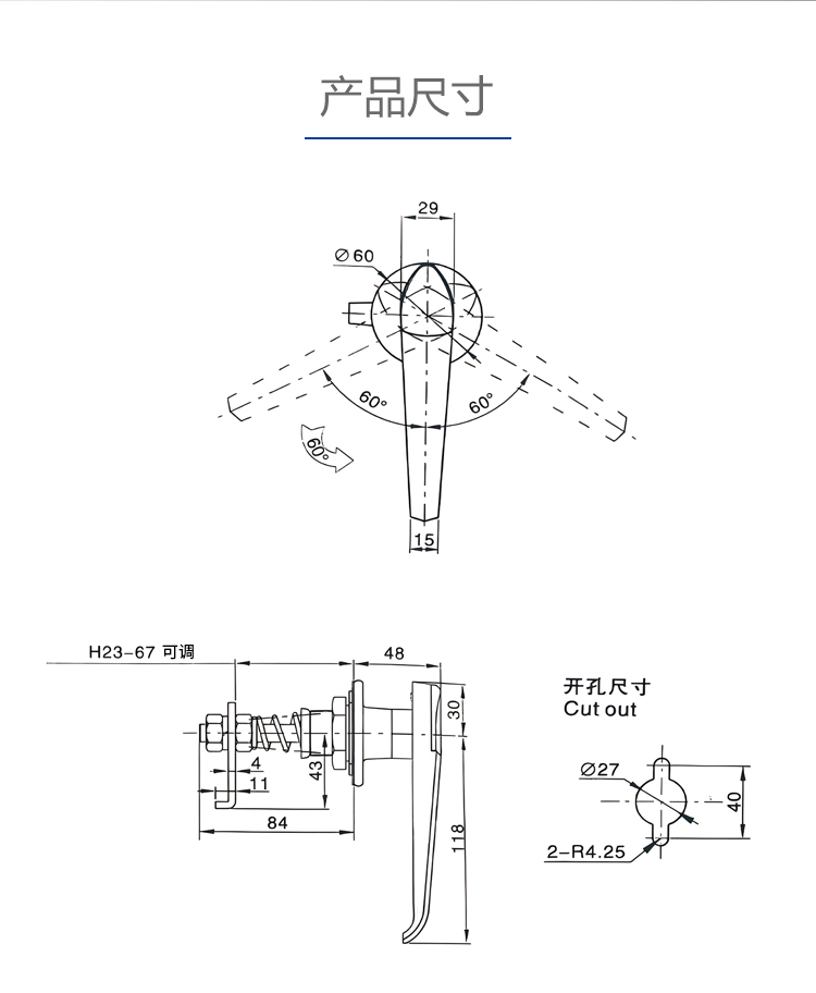 MS306-1A配电柜把手锁开关控制电箱机柜锁防水防尘执手锁加长手柄锁
