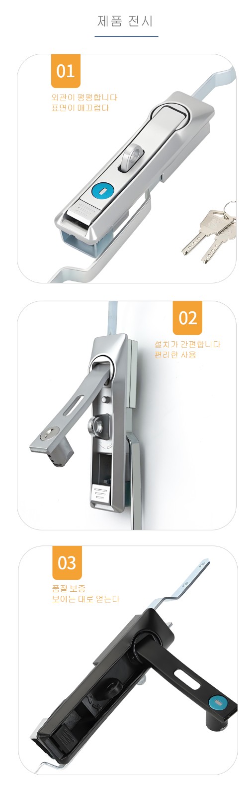 회사는 주로 전자 자물쇠 시리즈, RV 자물쇠 시리즈, 플랫 자물쇠 시리즈, 커넥팅로드 자물쇠 시리즈, 핸들 자물쇠 시리즈, 원통형 자물쇠 시리즈, 물 자동 판매기 자물쇠 시리즈, 스테인레스 스틸 시리즈, 힌지 시리즈, 액세서리 시리즈, 자물쇠 막대 시리즈 등을 운영합니다.