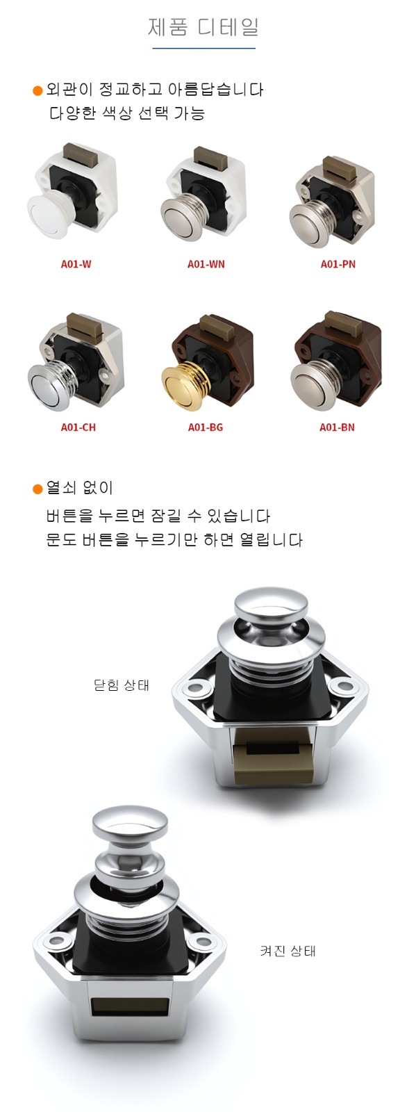 A01 캠핑카 잠금 장치, 요트 선박 버튼 잠금장치, 캐비닛 도어 서랍 압력식 트립 잠금장치, 키 없는 핸들, 현관 수납장 숨겨진 잠금장치