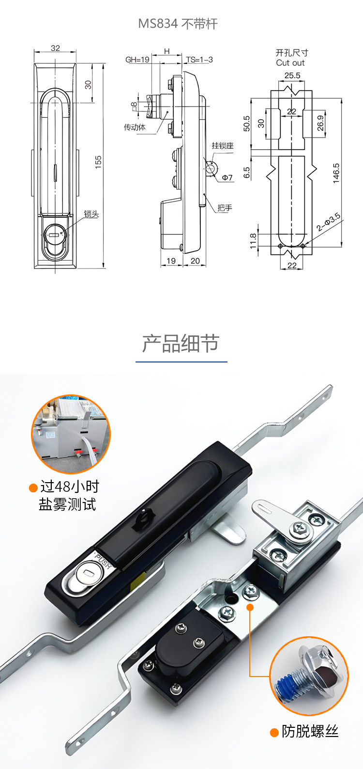 MS834锁 天地连杆锁环保设备柜锁 5G网络机柜门锁 控制柜威图柜