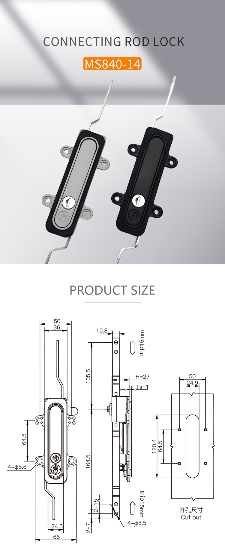 MS840-14 cabinet door lock, new energy cabinet lock, distribution cabinet lock, floor cabinet connecting rod lock, pull rod flat door lock